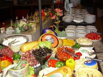 Acompanha o bufê vários tipos de saladas, tábua de frios e sobremesas. Possui também rodízio de calzones.